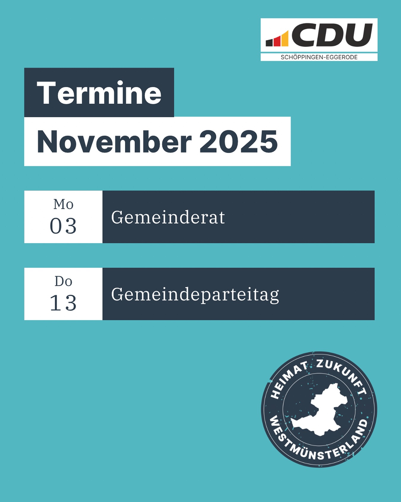 Hier sind die Termine der #CDU Schöppingen-Eggerode im November. Folgt uns, dann halten wir euch gerne auf dem Laufenden. Am 3. November tritt der neu gewählte Gemeinderat erstmalig zusammen. Es stehen viele Wahlen an. Die beiden Stellvertreter des neuen Bürgermeisters werden gewählt. Anschließend werden die Ausschüsse und deren Mitglieder gewählt. In den Ausschüssen werden auch sachkundige Bürgerinnen und Bürger tätig. Zu diesem Tagesordnungspunkt haben die Parteien und die Wählergemeinschaft sich auf einen gemeinsamen Antrag verständigt. Am 13. November findet unser Gemeindeparteitag statt. In diesem Jahr werden die Vorstandsposten gewählt. Als Gastrednerin aus der Landespolitik konnten wir Heike Wermer gewinnen. #schöppingen #eggerode #zeitfürkommunalpolitik #fürunserwestmünsterland